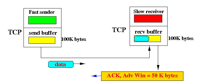 TCP 송신자가 데이터를 너무 빠르게 또는 너무 많이 전송하여 수신버퍼가 오버플로우(Overflow)하는 것을 방지한다. TCP의 수신자는 수신버퍼(receive buffer)를 가지는데, 상위 계층으로 세그먼트를 보내는 애플리케이션 프로세스가 수신버퍼로부터 데이터를 읽는 속도가 느릴 수 있다.