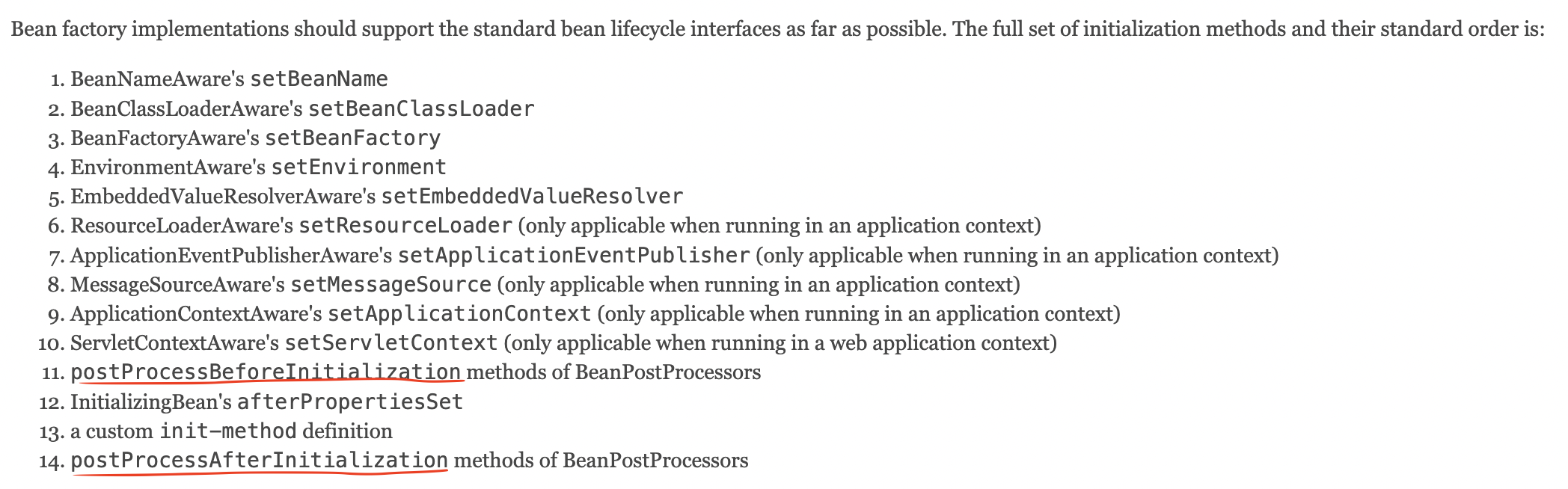 @Autowired를 통한 빈 주입은 AutowiredAnnotationBeanPostProcessor에 의해 이루어진다. 이 작업은 Spring 생명주기의 postProcessBeforeInitialization 단계에서 실행된다. 따라서 @PostConstruct로 실행되는 메서드에서는 이미 빈이 주입된 상태로 실행된다.