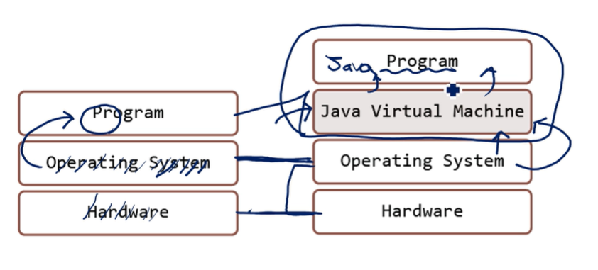 이유는? 중간에 JVM이 있기 때문이다. OS에서 오는 차이점을 자바 프로그램이 고려하지 않아도 JVM이 알아서 적절히 처리해주기 때문에 자바 코드를 수정하지 않고 어느 JVM 위에서든 프로그램을 실행시킬 수 있다.