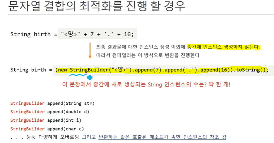 StringBuilder 클래스는 buffer을 가지고 있다. buffer는 저장 공간이라고 생각하자. 인자로 전달되는 데이터들을 자료형에 관계없이 저장만 한다. toString() 했을 때, 문자열 인스턴스를 만들고 그 인스턴스의 참조값을 반환한다. 위의 예제에서는 StringBuilder할 때와 toString할 때 각각 인스턴스를 생성한다. 따라서, 총 2개의 인스턴스가 생성된다.