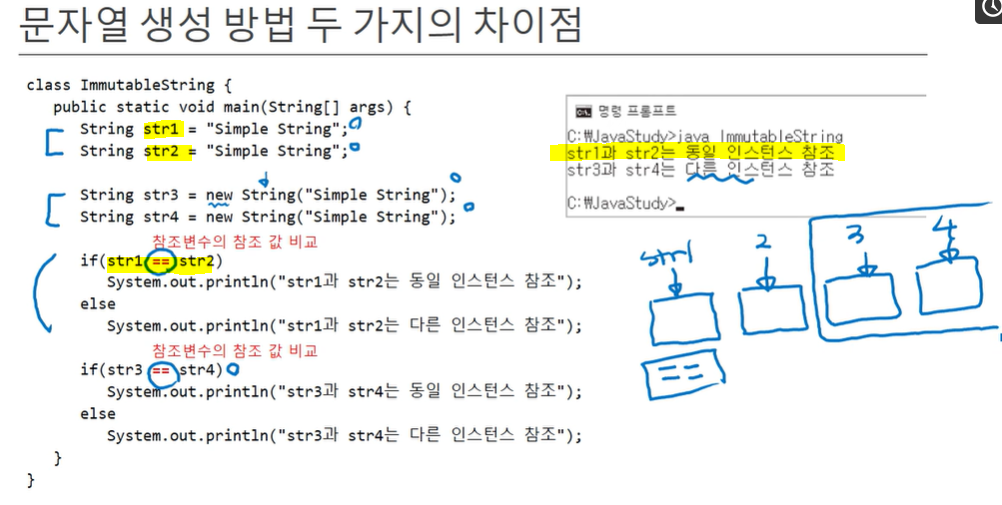 String 인스턴스는 Immutable(불변) 인스턴스이다. Immutable는 생성 이후 값의 변경을 허용하지 않음을 의미한다. JVM은 새 인스턴스의 문자열(str2)을 확인하고 이미 같은 문자열 인스턴스(str1)가 있으면 기존 인스턴스의 참조값을 리턴한다. 굳이 같은 문자열이라도 새 인스턴스가 필요하다면 new로 새 인스턴스 생성해주면 된다.