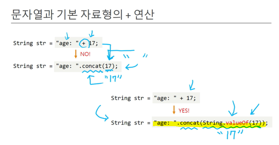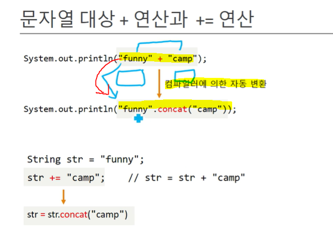 참조값끼리 덧셈 연산 불가능 하지만, 컴파일러에 의해 concat으로 자동 변환(JVM이 바꿔주는 건 아님)