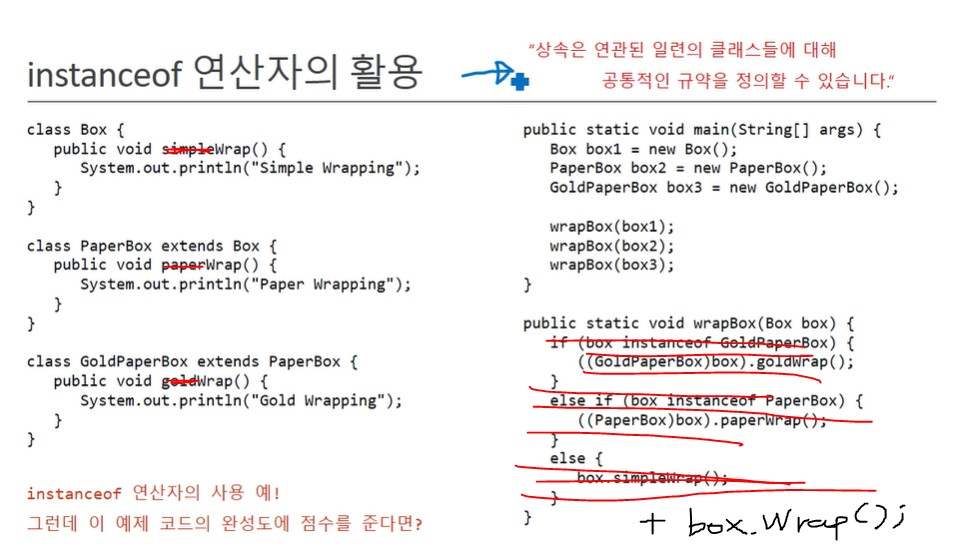 instaceof는 연산자이고 ref와 ClassName은 피연사자이다. ref는 특정 인스턴스를 참조하는 참조변수이다. 해석하면 ClassName형 참조변수로 ref가 가리키는 인스턴스가 참조 가능한지 여부를 묻는 것이다. 따라서, 참조 가능하면 true, 가능하지 않으면 false을 반환한다. 간단하게, 참조가능성을 묻는다고 생각하면 된다.
