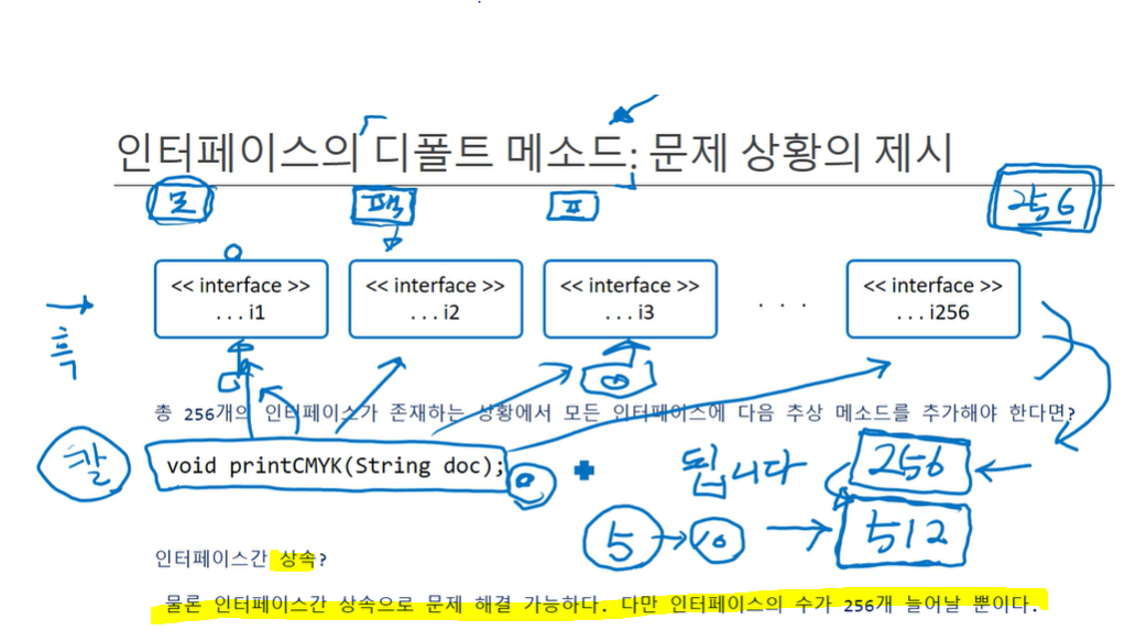 256가지의 인터페이스(모니터, 팩스, 프린터,...)가 가정해보자.모든 인터페이스에 칼라 출력 메소드를 추가해야 한다면 어떻게 해야 할까? 물론 인터페이스 상속으로 해결할 수 있다. 하지만 상속으로 인해 인터페이스는 256가지에서 512가지로 2배 늘어날 것이다. 인터페이스 수를 늘리지 않고 해결할 수 있는 방법은 없을까? 자바에서도 이 같은 상황을 겪었고, 문제를 해결하기 위해 새로운 문법 default을 도입했다.