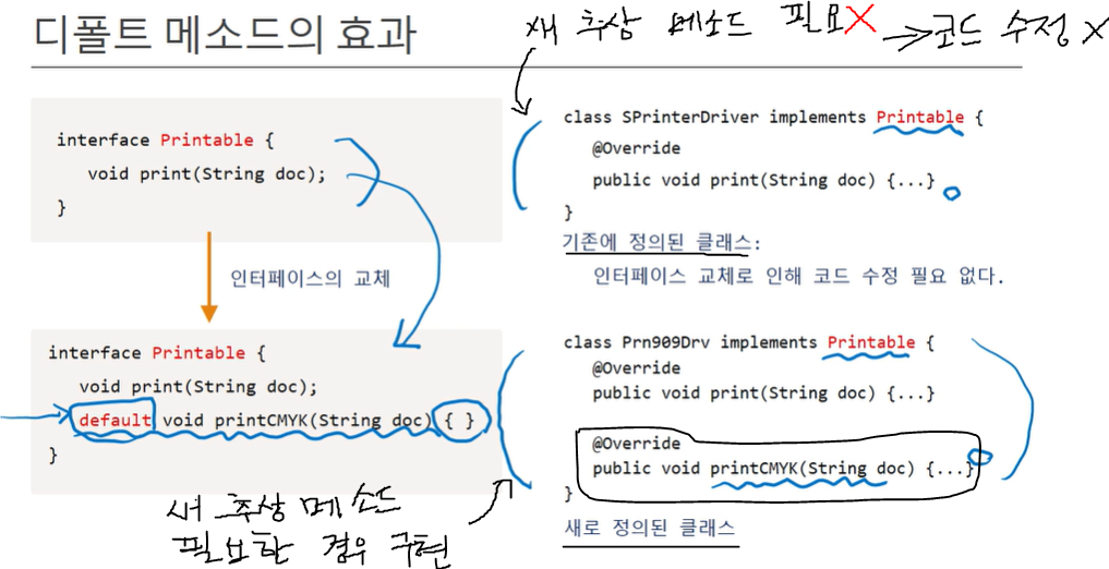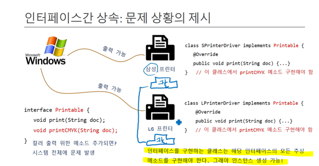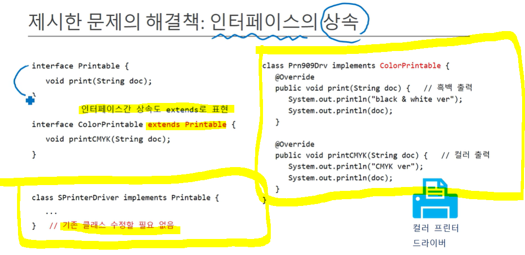 기존에 존재하던 인터페이스에 새로운 메소드를 추가하는 것은 부담이 되고, 이미 배포된 드라이버(인터페이스 구현 클래스)를 수정하는 불합리한 상황에 놓일 수 있기 때문에, 상속을 통해 새로운 인터페이스(ColorPrintable)를 추가하는 것이다.