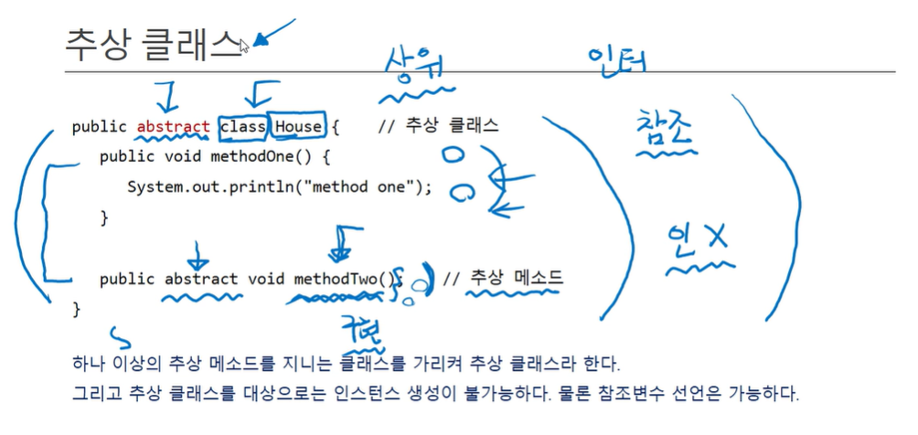 추상 클래스를 extends로 상속 받은 자식들과 인터페이스를 implements하고 구현한 자식들만 객체를 생성할 수 있다. (결국 자식 클래스가 무언가 반드시 구현하도록 위임해야할 때 사용한다.)