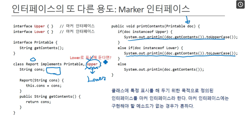 위의 예에서 만약 doc instanceof Upper가 true 라면, 그 의미는 인스턴스가 Upper의 구현체를 가지고 있다는 의미일 것이다. 하지만 Upper은 마커 인터페이스로서 추상 메소드 자체가 없다. 따라서 인스턴스는 Upper가 implements 되어 있으면 구현체가 없어도 성립한다. Upper가 implements됐다면 toUpperCase()를 호출하여 모든 문자를 대문자로 바꿀 것이다. 이 처럼 인터페이스를 가지고만(implements) 있으면 어떤 용도인지 확인하는 용도로 사용하는 인터페이스를 마커 인터페이스라고 한다.