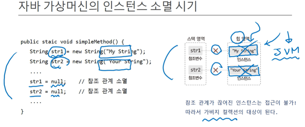 한 인스턴스 X를 두 참조변수 x, y가 참조한다 가정해보자. x를 지웠다고 해서 인스턴스 X도 지워지면 어떤 문제가 발생할까? y는 존재하지만 x를 지우면서 X도 지웠으므로 y가 참조하는 인스턴스가 의도치 않게 없어진게 될 것이다. 이와 같은 이유로 스택과 힙을 구분해주는 것이다. 인스턴스가 아무에게도 참조되지 않았을 때 비로소 지워야 한다. 다행히도 JVM이 힙 영역을 스캔하면서 해당 인스턴스를 참조하는 변수가 있는지 확인하고, 아무도 참조하지 않았으면 인스턴스를 지운다. 이러한 액션을 가비지 컬렉션(garbage collection)이라 한다. 따라서, 힙 영역을 가비지 컬렉션 영역이이라고 한다.