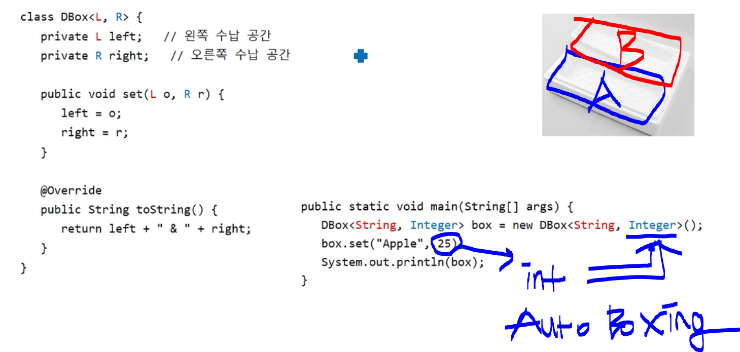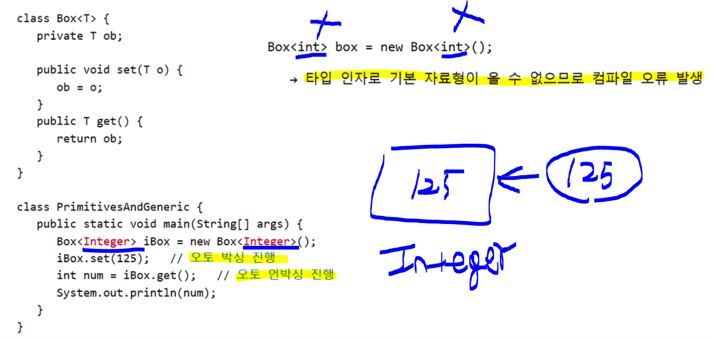 타입 인자로 기본 자료형이 올 수 없다. 하지만 오토 박싱/언박싱으로 해결 가능하다.