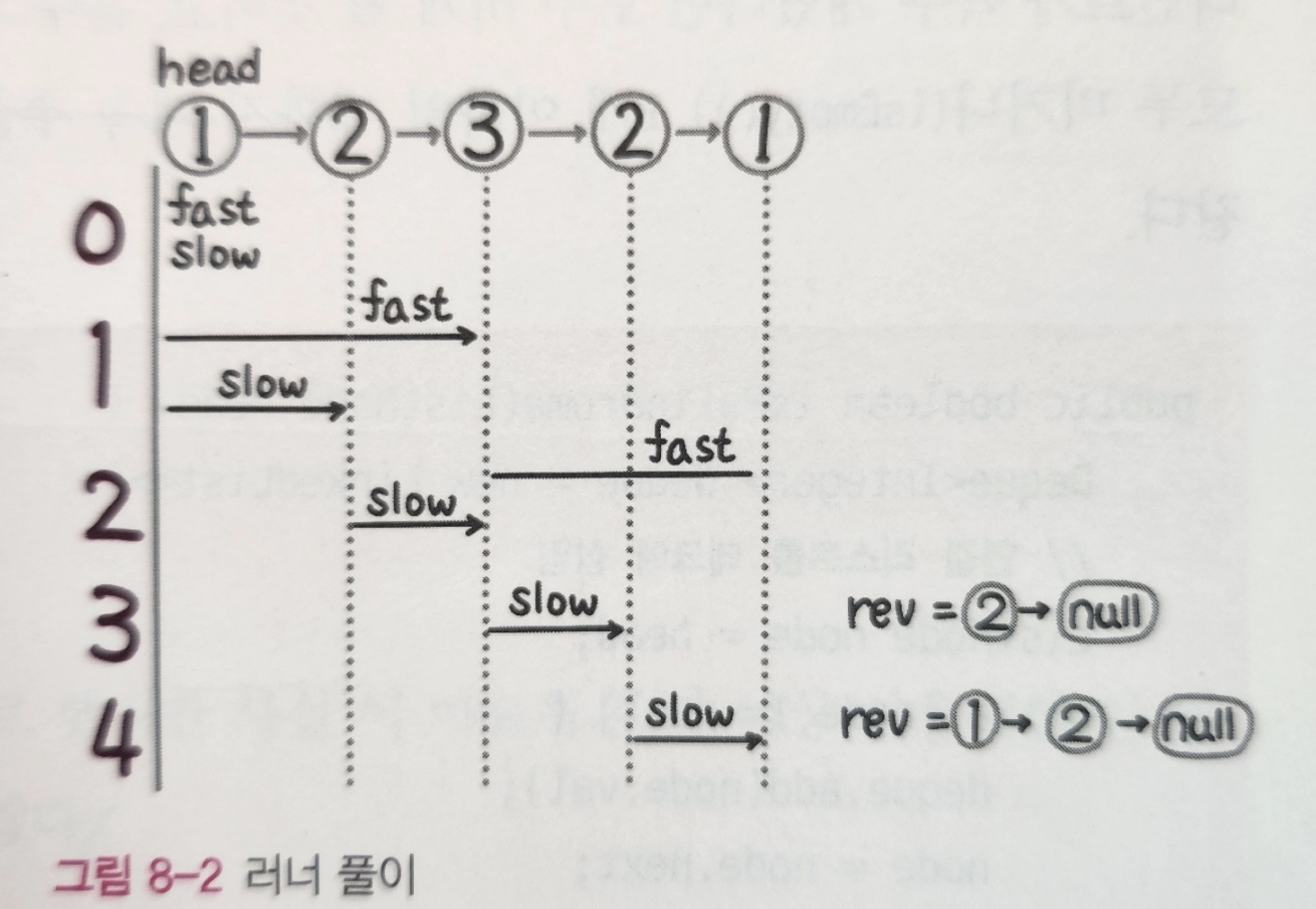 - 이때 빠른 러너가 연결 리스트의 끝에 도달하면, 느린 러너는 정확히 연결 리스트의 중간 지점을 가리키게 된다.