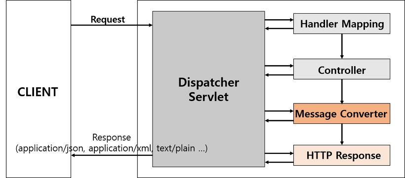 사용자의 요청이 오면 MessageConverter를 통해서 application/json, text/plain 등 알맞는 형태로 리턴되게 된다.
