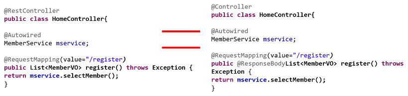 - 그에반해 @RestController 에서 return 되는 값은 View Page를 통해 출력되는 것이 아니라 HTTP ResponseBody에 직접 쓰여지게 된다.