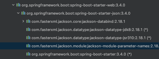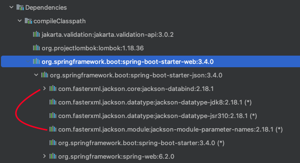 ParameterNamesModule 모듈을 사용하려면 의존성을 추가하거나 ObjectMapper에 설정해주어야 하는데, spring-boot-starter-web에서는 의존성이 추가되어서 따로 추가하지 않아도 적용된다.