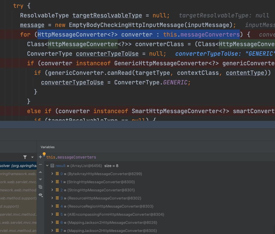 converter 중 MappingJackson2HttpMessageConverter가 선택이 된다. converter가 결정되면 코드에서 볼 수 있듯이 read 메서드를 통해 body 값을 읽어온다.