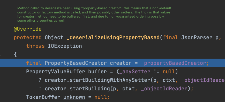 Method called to deserialize bean using "property-based creator": this means that a non-default constructor or factory method is called, and then possibly other setters. The trick is that values for creator method need to be buffered, first; and due to non-guaranteed ordering possibly some other properties as well.