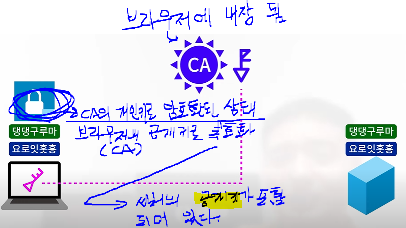 정품을 인증해주는 공인된 민간기업: Certificate Authority(CA), CA는 브라우저(크롬, 사파리, 파이어폭스, 엣지, 익스플로우...) 에 내장돼 있다.