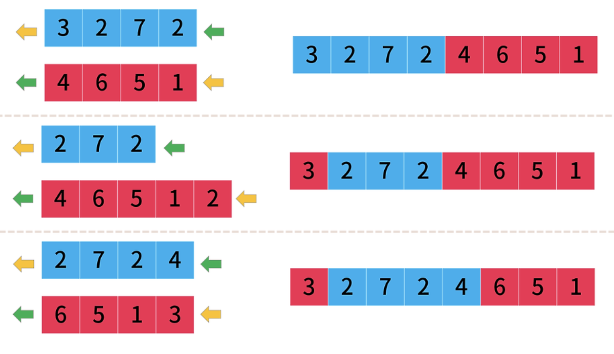 두 큐를 하나의 큐로 통합해서 볼 수 있다. 각 큐의 포인터가 큐의 요소 대소 관계를 따지며 이동할 것이다. 최악의 상황은 아무리 이동해도 두 큐의 요소의 합이 같은 경우가 없을 때이다. 그럴 경우 멈춰주고 -1을 반환해줘야 한다. 이동하다 보면 포인터가 다시 원상태로 돌아올 상황이 생길 것인데, 이때 멈춰줘야 한다. 이때까지 이동을 얼마나 할지 알아야 한다. 문제에서 -1을 반환하는 예시를 직접 시뮬레이션하면서 하니까 이해가 쉬웠다.