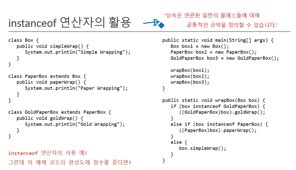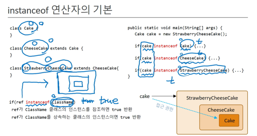 instaceof는 연산자이고 ref와 ClassName은 피연사자이다. ref는 특정 인스턴스를 참조하는 참조변수이다. 해석하면 ClassName형 참조변수로 ref가 가리키는 인스턴스가 참조 가능한지 여부를 묻는 것이다. 따라서, 참조 가능하면 true, 가능하지 않으면 false을 반환한다. 간단하게, 참조가능성을 묻는다고 생각하면 된다.
