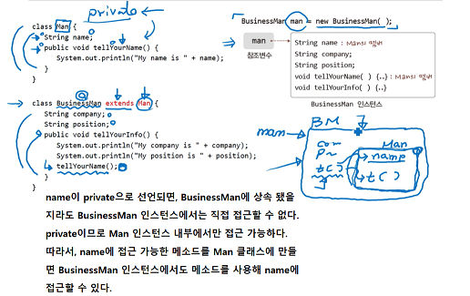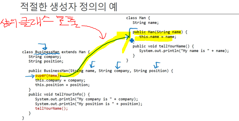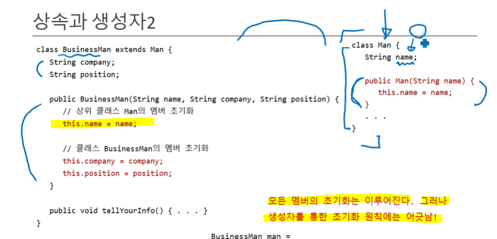멤버를 초기화할 때, 이상적인 원칙은 그 클래스의 멤버는 해당 클래스의 생성자에서 초기화시켜주는 것이다(생성자를 통한 초기화 원칙). 하지만 아래의 예제에서는 상위 클래스 Man의 멤버 변수 name을 초기화할 때 하위 클래스 안에서 초기화해주었다. 물론, 문제는 없지만 원칙에 어긋난 방법이다.