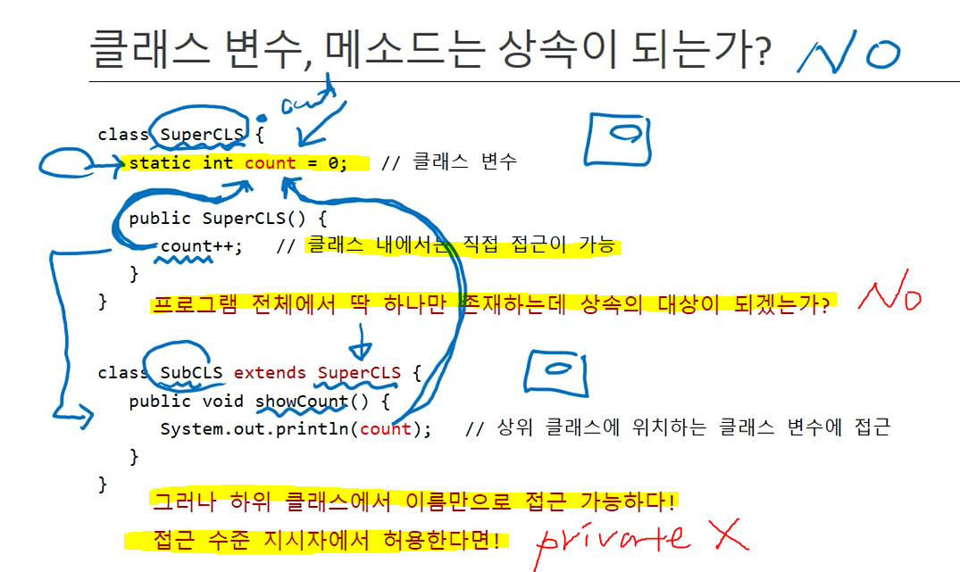 static 변수/메소드(클래스 변수/메소드)가 선언된 클래스에는 접근 권한이 있을 뿐 직접 가지고 있지 않다. 하위 클래스는 직접 상속 받지 않지만 접근할 권한은 가지고 있다. 부모가 가지고 있지 않으니 자식도 상속 받지 못한다고 생각하자.