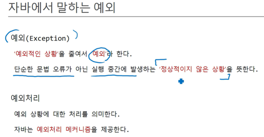 프로그래머의 실수가 아니라 사용자의 실수가 예외다. 즉, 사용자가 기대하지 못했던 상황을 예외라고 한다. 그러한 예외 상황을 프로그래머의 처리를 예외처리라고 한다.