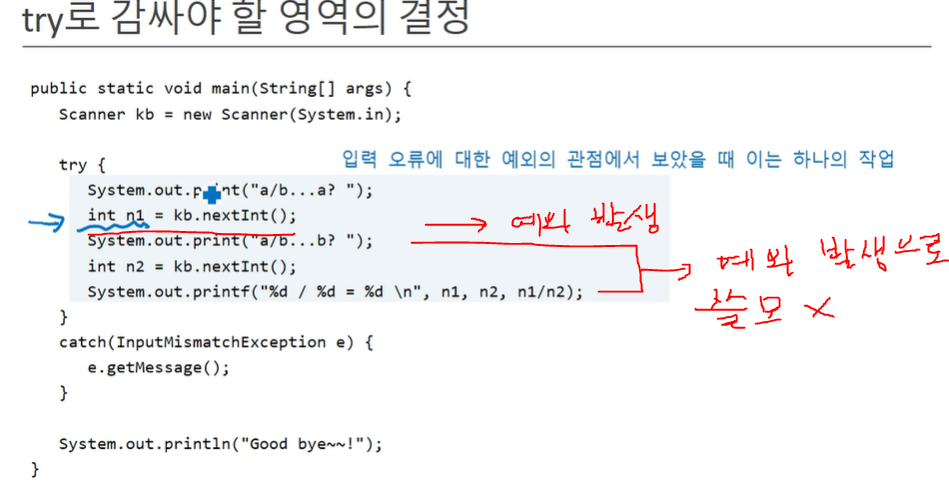 예외 처리 후, catch문 뒤의 코드부터 실행한다. 그럼 try문 안의 예외 이후의 코드는 왜 건너뛸까? 입력 오류에 대한 예외 관점에서 보았을 때 try문의 코드는 하나의 작업이다. 따라서, 예외 발생 이후의 코드는 예외 발생으로 인해 쓸모 없는 작업이 될 것이다.