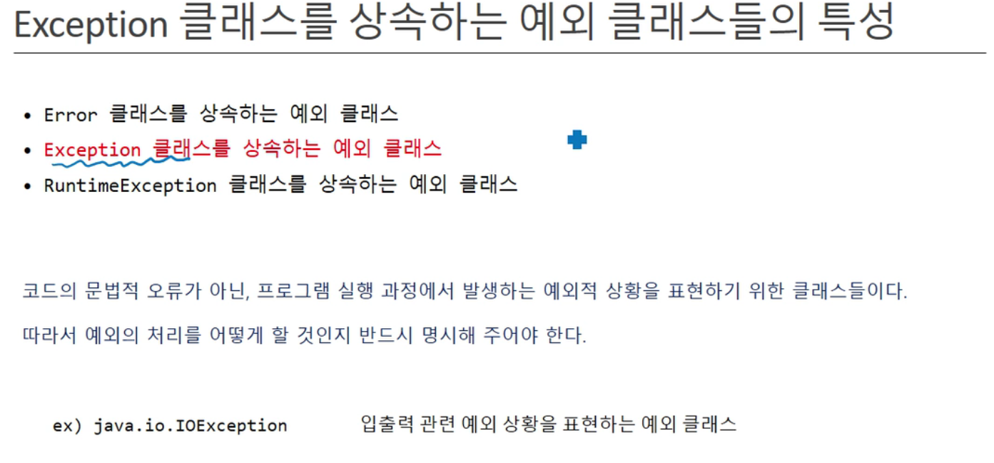 Exception만 상속하는 클래스는 진정한 예외 클래스라고 할 수 있다. 자바 컴파일러도 개발자가 처리하게 종용한다. Exception을 상속하는 예외는 try~catch문을 통해 직접 처리하거나 throws을 통해 넘겨야 한다.