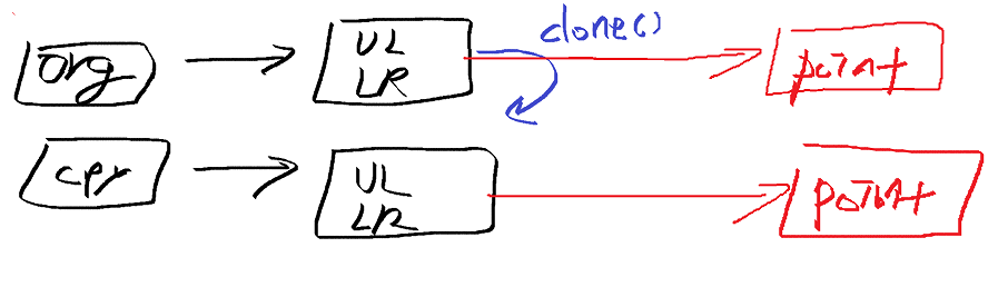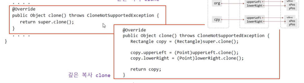 위의 예제에서 cpy는 clone() 호출에 의해 org가 참조하는 인스턴스를 복사한 새 인스턴스를 참조한다.