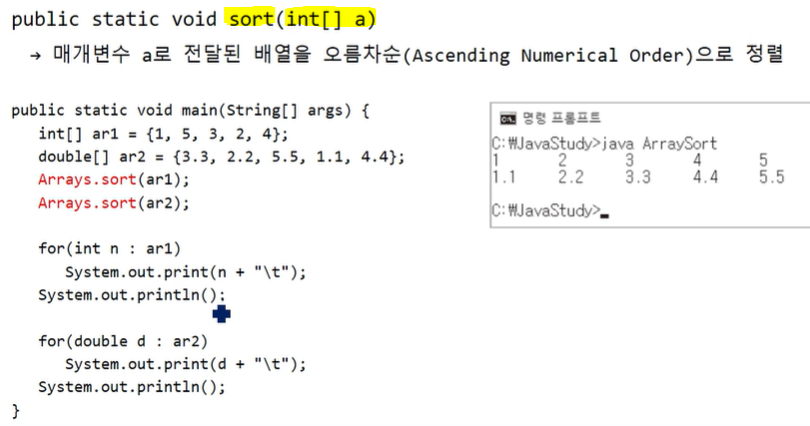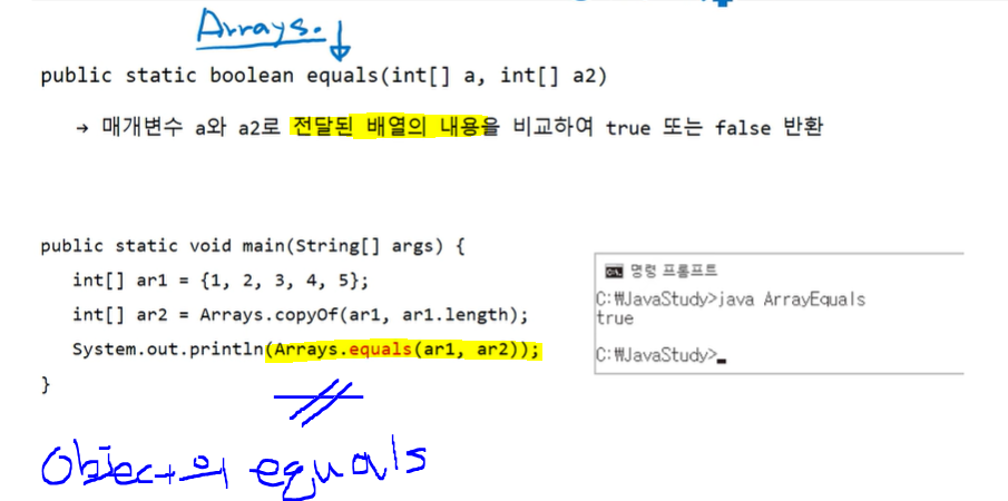 배열의 각 요소 비교는 object 클래스의 equals 메소드 호출에 의해 비교된다.