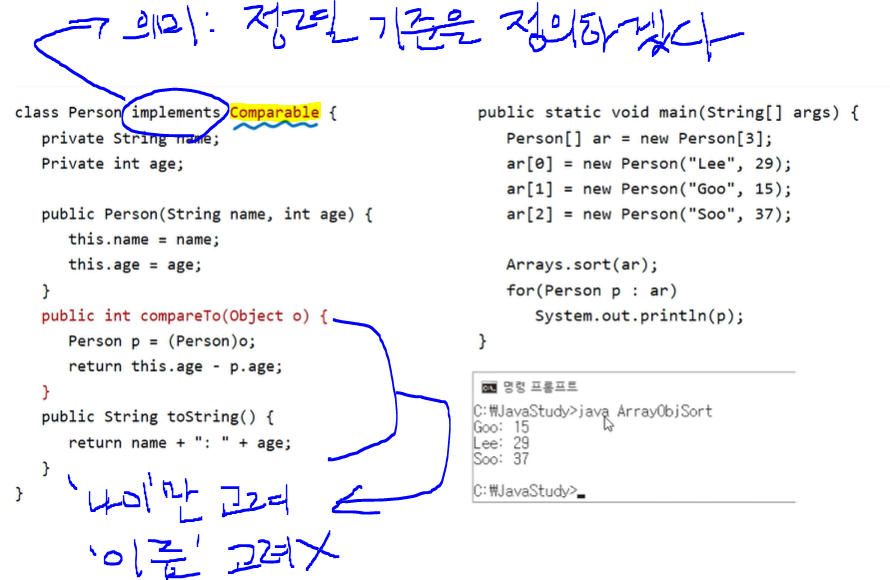 Comparable 인터페이스의 유일한 메소드 compareTo를 디자인해야 한다.