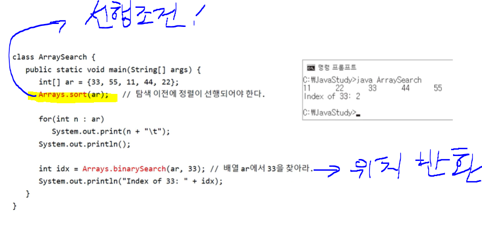 binarySearch는 오버로딩 되어있어서 int 뿐만 아니라 여러 기본 자료형도 가능하다. 배열의 요소가 인스턴스 compareTo 오버라이딩을 통해 적절히 디자인하면 된다. 단, 이진 탐색을 위해서는 배열이 오름차순으로 정렬되어 있어야 한다(선행조건).