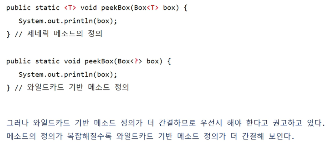 와일드카드 코드가 더 간결해 보인다. 문서에서도 제네릭 메소드보다 와일드카드를 권고한다.