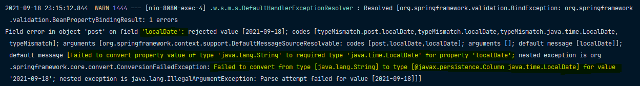 Post의 LocalDate이 String으로 들어오는 localDate을 LocalDate으로 변환하지 못하면서 에러가 나는 것이다. @DataTimeFormat을 사용하면 해결 가능하다.