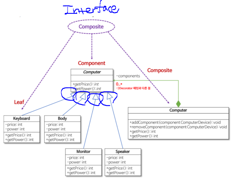 Composite : 전체 클래스, 복수개의 Component를 갖는다. 심지어, 복수 개의 Leaf, 심지어 복수 개의 Composite 객체를 부분으로 가질 수 있다