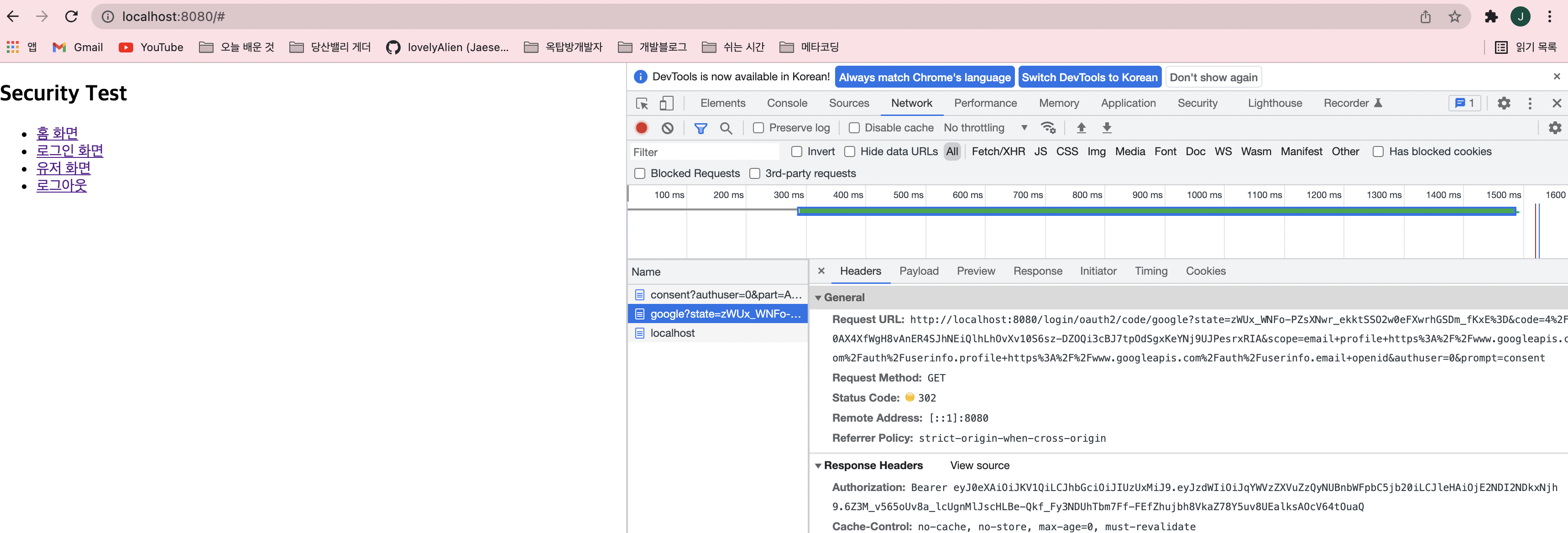 이미지를 보면 response-header에 bearer-type의 jwt가 잘 담겨있다. 여기서 의문점이 든 것은, 인증 코드 요청, 인증 토큰 요청, 프로필 정보 요청 순서로 진행해서 jwt를 만들기까지 했는데 왜 다시 코드 요청 uri로 리다이렉트 됐냐는 것이다.