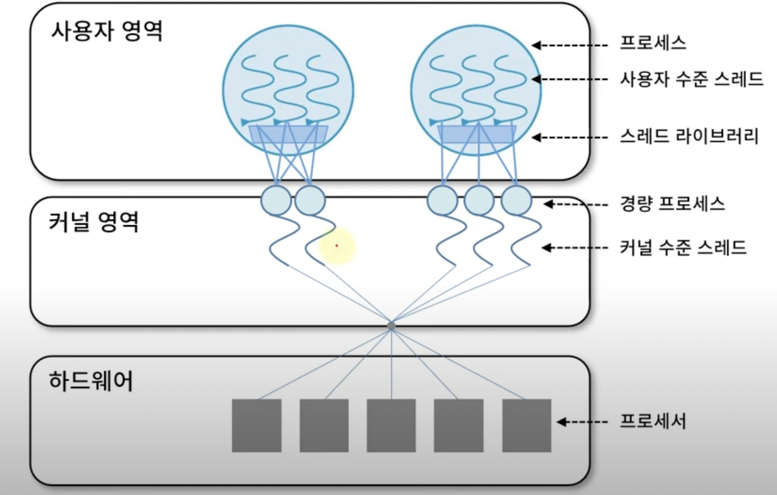 - 커널이 스레드 만들어서 api 형태로 제공(커널도 프로그래머가 만든 프로그램!)