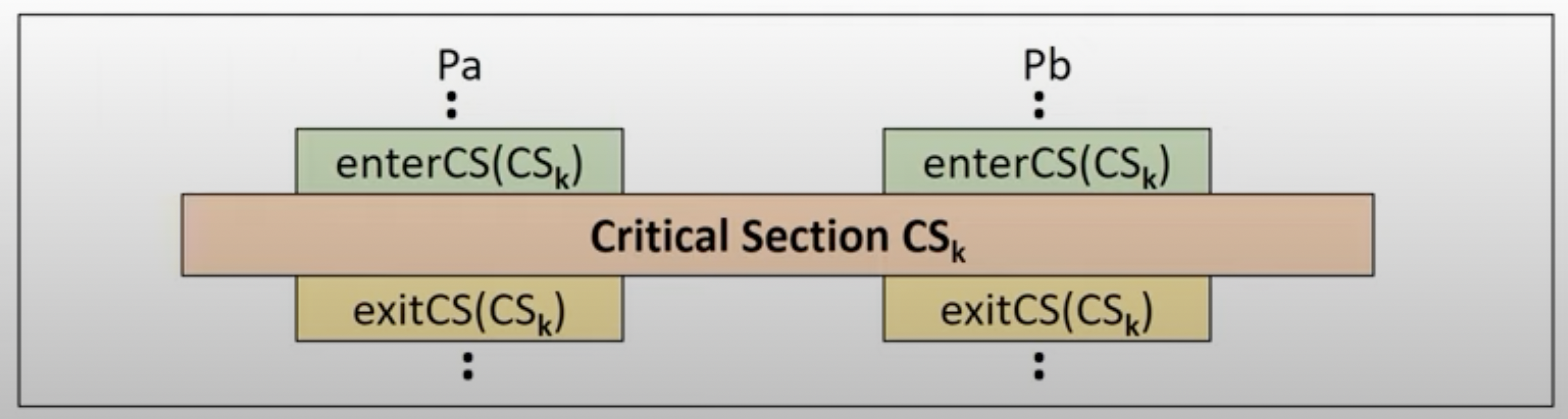 - Mutual exclusion: CS에 프로세스 있으면, 다른 프로세스 진입 금지