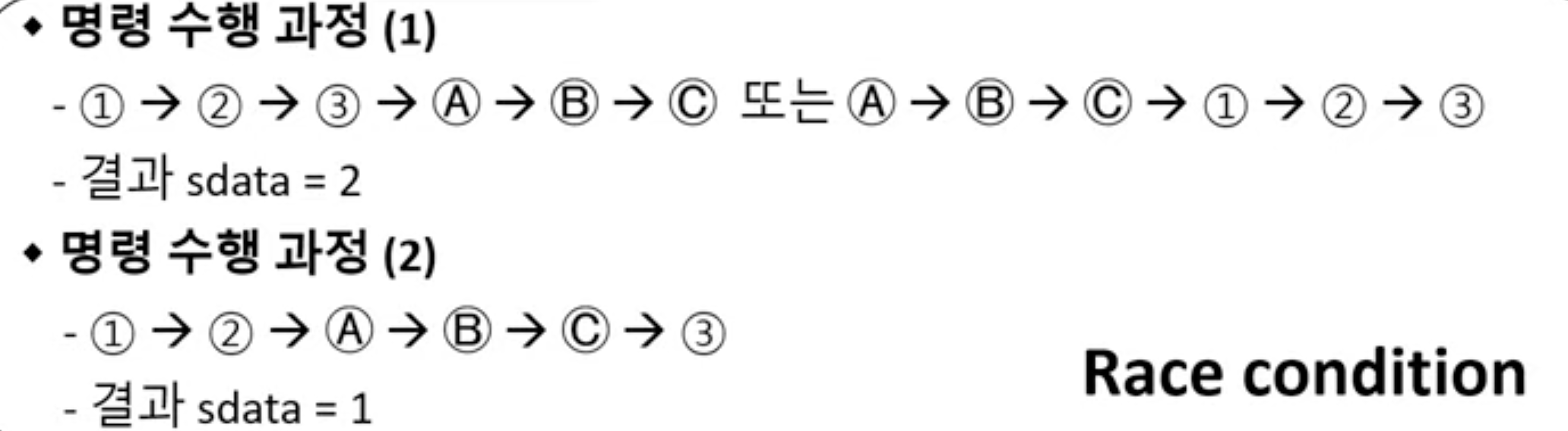 - race condition: 실행 순서에 따라 결과가 달라짐